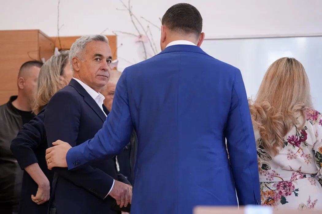 Calin Georgescu (S) si George Simion (cu spatele), candidatul Aliantei pentru Unirea Romanilor ( AUR) la alegerile prezidentiale, isi exercita dreptul la vot, in cadrul celui de-al doilea tur al alegerilor prezidentiale, in Bucuresti, duminica, 18 mai 2025. ANDREEA ALEXANDRU/MEDIAFAX FOTO