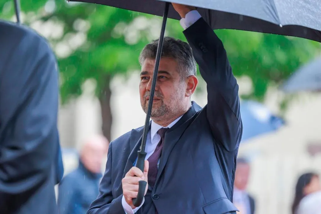 Premierul Marcel Ciolacu și-a ținut singur umbrela, fără să uzeze de protocol