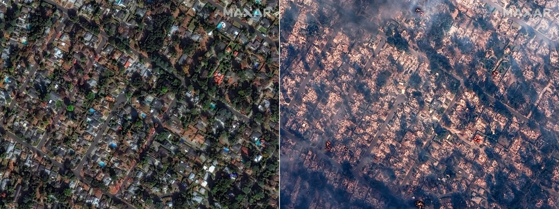 Distrugerea provocată de incendiile de la Los Angeles, surprinsă în imagini „înainte și după” din satelit
