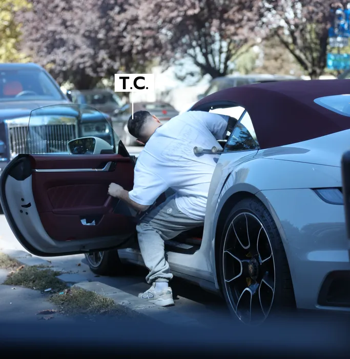 T. C. intră cu dificultate în Porsche (Foto: CANCAN.RO)
