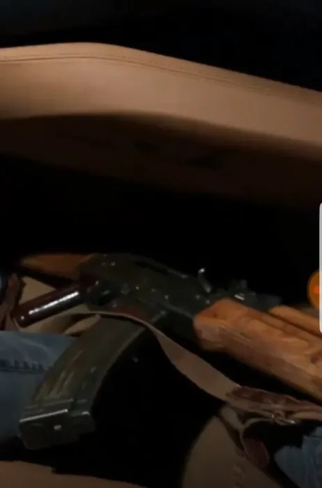 Unul dintre băieții din grup ține un Kalașnikov pe genunchi, în Ferrari