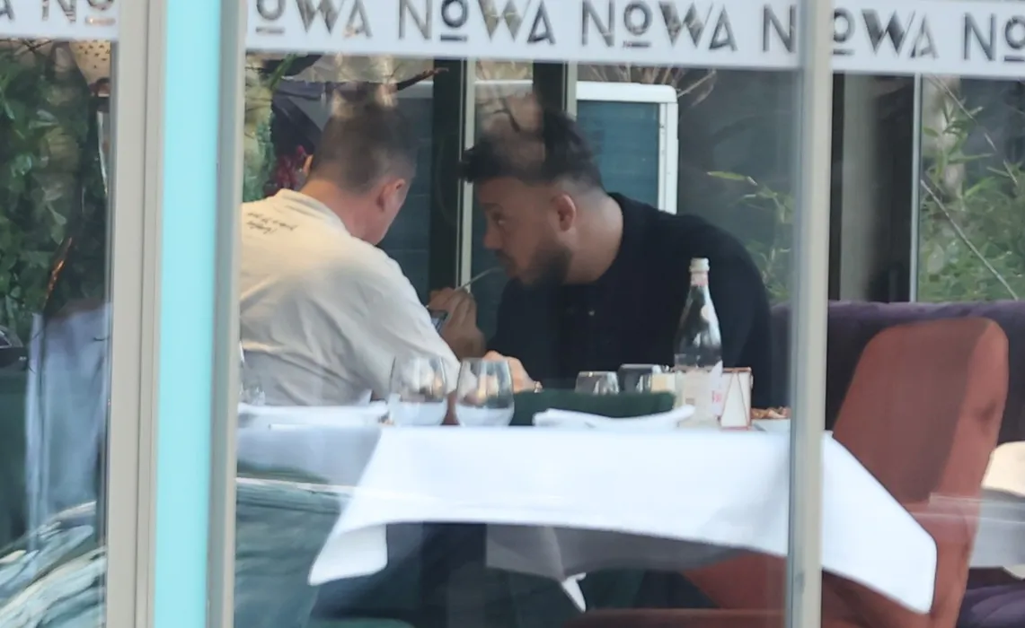 Gabi Bădălău ia prânzul alături de un amic (SURSA FOTO: CANCAN.RO)