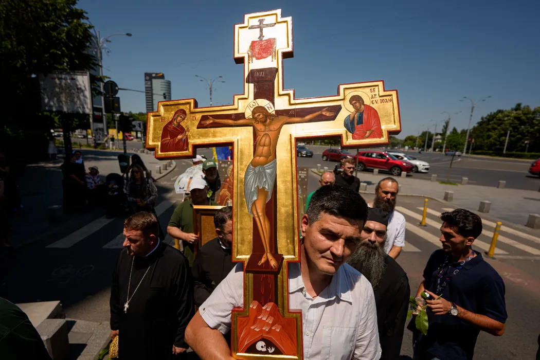 Un barbat tine o cruce in timpul unei contramanifestatii organizate de asociatia ''Fratia Ortodoxa'' fata de marsul comunitatii LGBTQ+ ''Bucharest Pride 2025'', in Bucuresti, duminica, 8 iunie 2025. Aproximativ 100 de persoane purtand cruci, icoane si agheasma au participat, duminica, la un mars de ''izgonire a duhurilor necurate lasate in urma de parada LGBTQ'' conform organizatorilor, pe acelasi traseu ca participantii la Bucharest Pride 2025. ANDREEA ALEXANDRU / MEDIAFAX FOTO