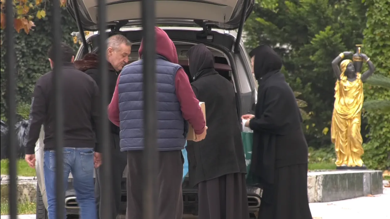 Gigi Becali, înconjurat de măicuțe, lângă portbagajul plin al mașinii sale (Foto: CANCAN.RO)
