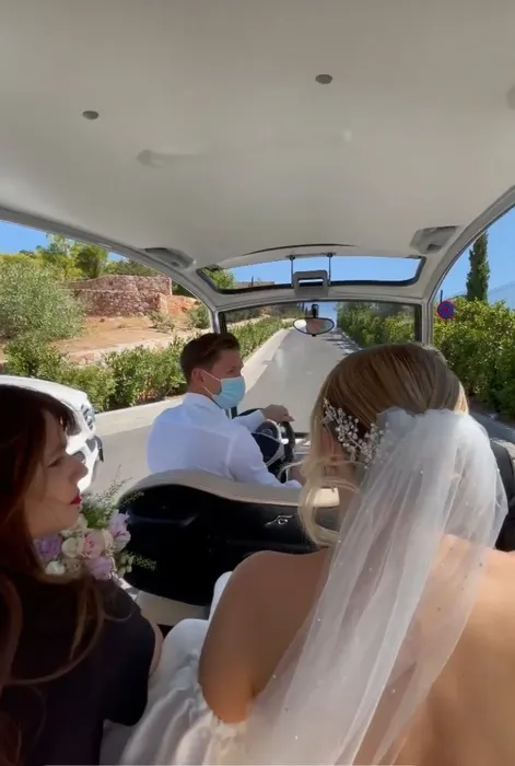 Sabina Trandafir, în mașină, înainte de a ajunge în fața altarului