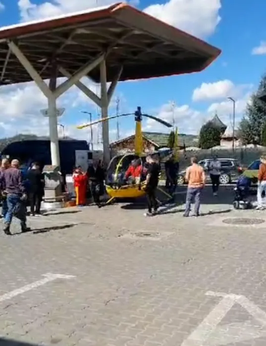 Imagini virale! Un elicopter a aterizat într-o benzinărie în Curtea de Argeș. Localnicii au rămas cu gura căscată: „A băgat GPL de 50 lei!”