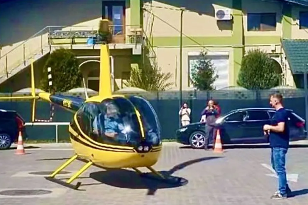 Imagini virale! Un elicopter a aterizat într-o benzinărie în Curtea de Argeș. Localnicii au rămas cu gura căscată: „A băgat GPL de 50 lei!”