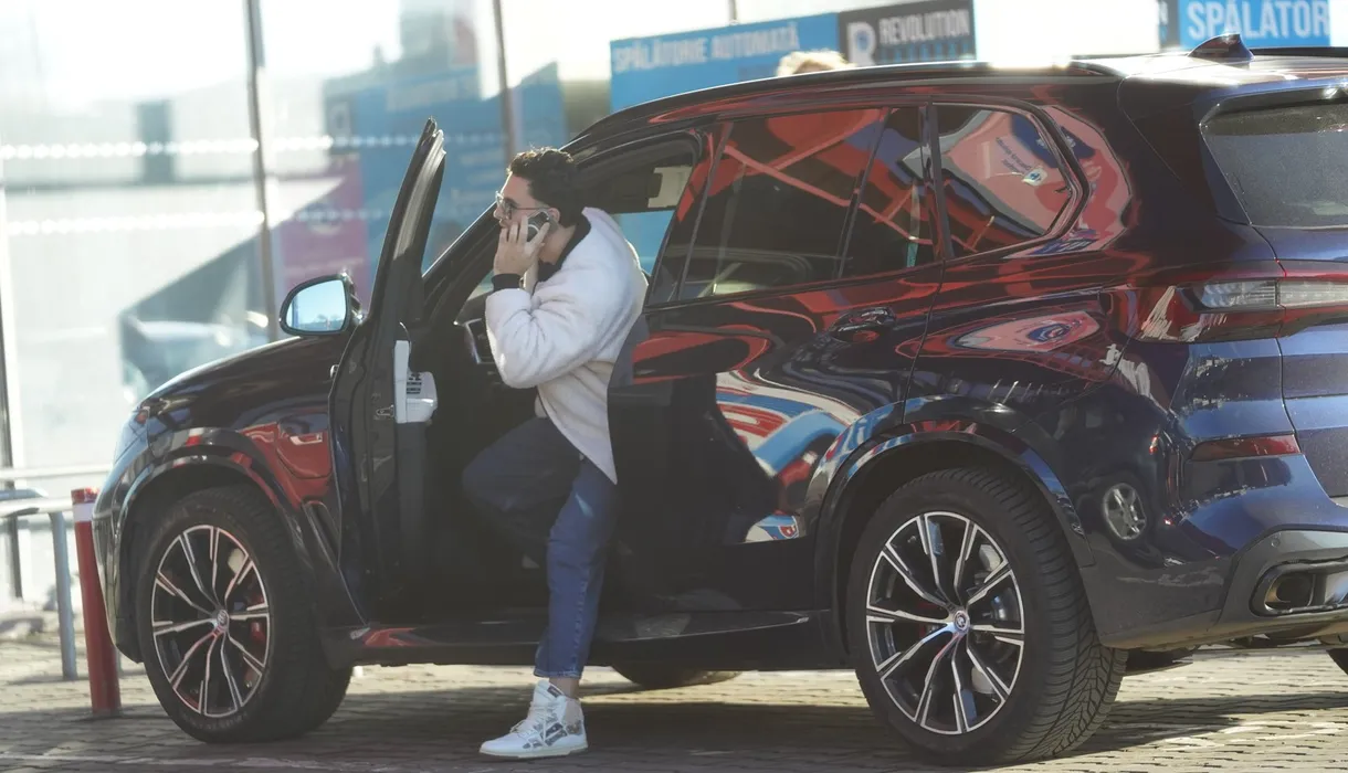 Mario Fresh coboară din mașină în timp ce vorbește la telefon (SURSA FOTO: CANCAN.RO)