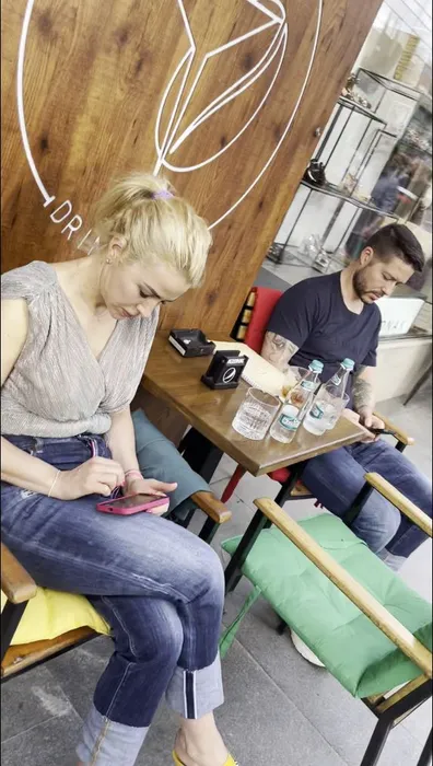 Jorge și soția lui, Ramona, stau pe telefoane, la o terasă din Calea Victoriei (Foto: CANCAN.RO)