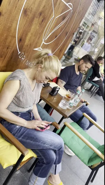 Jorge și soția lui, Ramona, stau pe telefoane, la o terasă din Calea Victoriei (Foto: CANCAN.RO)