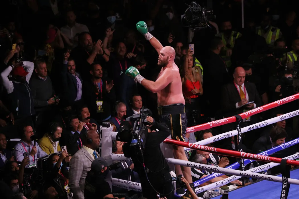 Tyson Fury celebrates in the ring after knocking out Deontay Wilder in the 11th round of the Tyson Fury vs Deontay Wilder III 12-round Heavyweight boxing match, at the T-Mobile Arena in Las Vegas, Nevada on Saturday, October 9th, 2021. Photo by /UPI,Image: 637380172, License: Rights-managed, Restrictions: , Model Release: no, Credit line: Profimedia