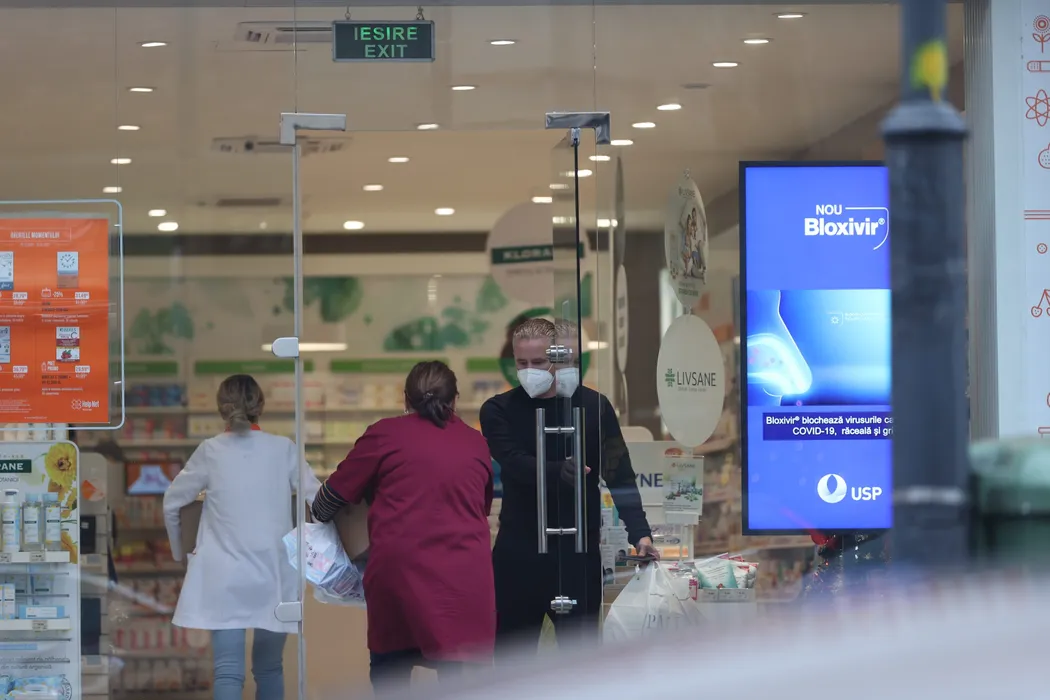 Laurențiu Reghecampf ține ușa unor angajate ale farmaciei/ Sursă foto: CANCAN.RO