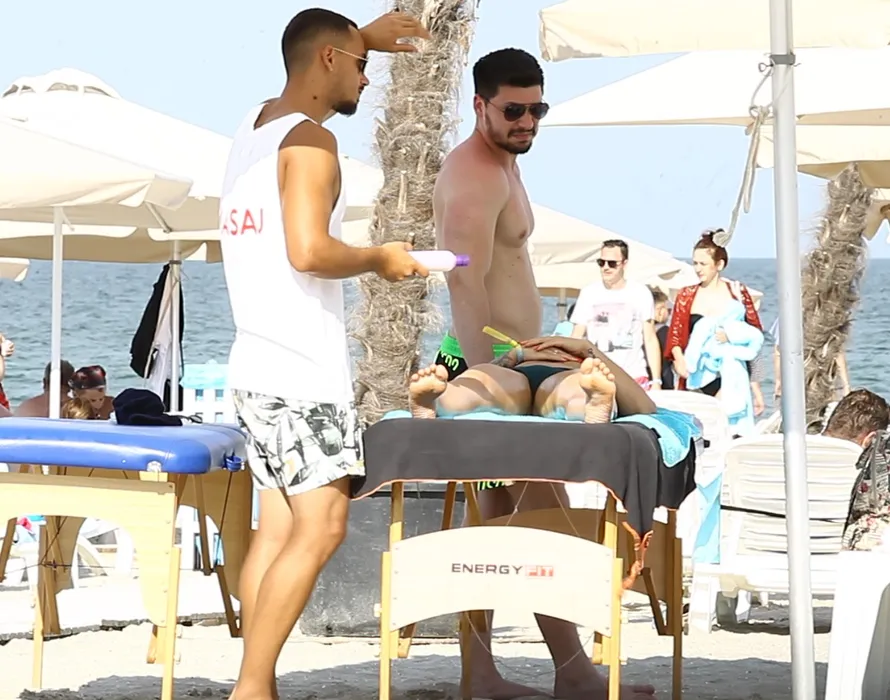 Nicoleta Nucă, la masaj, pe plajă, sub privirile vigilente ale iubitului ei
