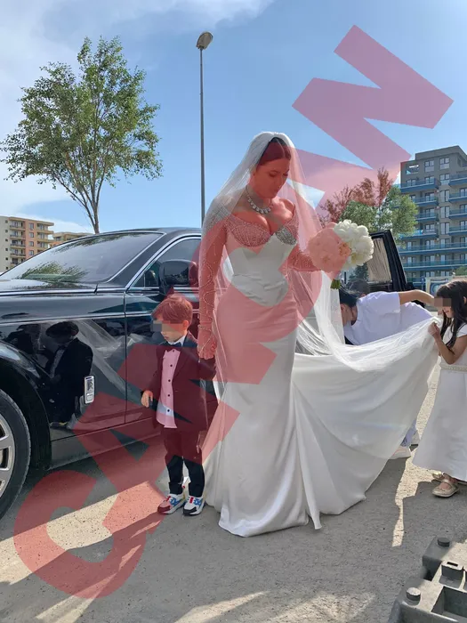 Apariție impecabilă a miresei lui Florin Salam! Roxana Dobre s-a dat jos din Rolls Royce, într-o rochie unică semnată de Cristina Săvulescu