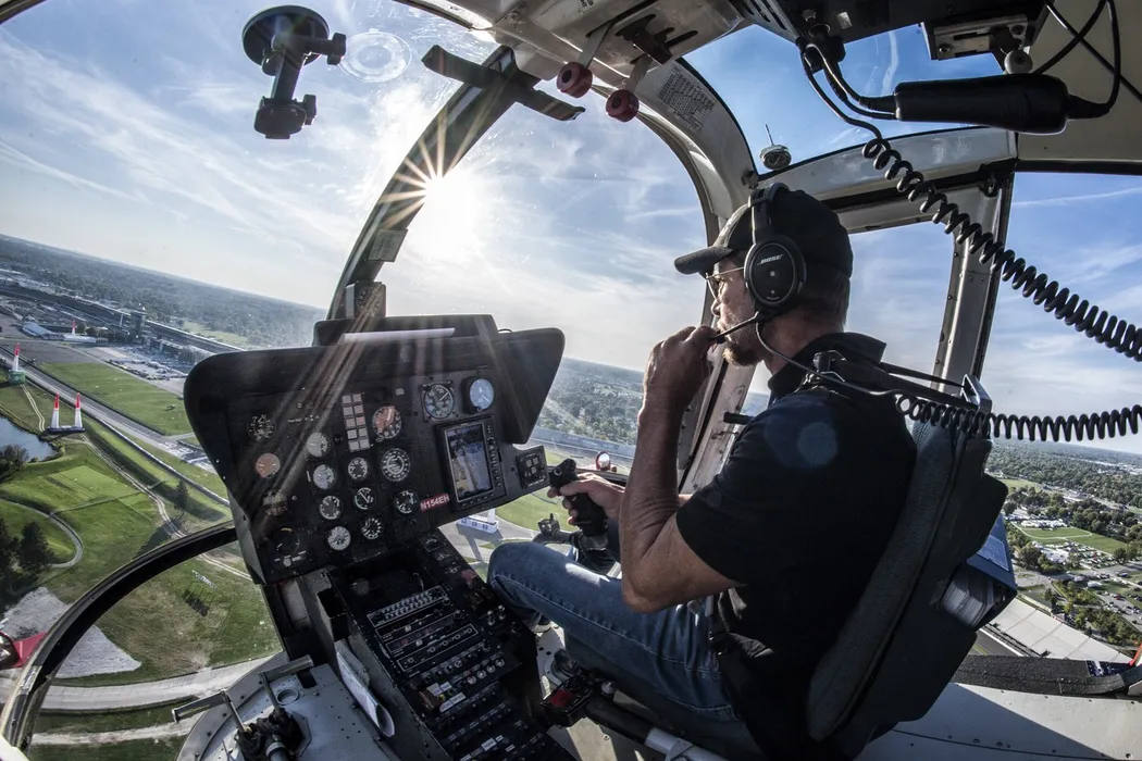Pilotul Red Bull Stratos Felix Baumgartner din Austria ca pilot de elicopter în timpul zilei de calificare la cea de-a opta etapă a Campionatului Mondial Red Bull Air Race de la Indianapolis Motor Speedway, Statele Unite, pe 14 octombrie 2017. Foto: Profimedia