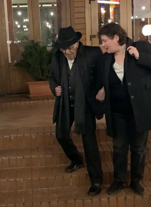 Mihai Șora este ajutat de soție să coboare scările restaurantului