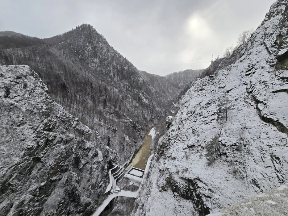 Ninge ca în povești la Barajul Vidraru. Imagini de colecție cu stăvilarul golit de apă, dar acoperit de o ‘pătură’ proaspătă de omăt