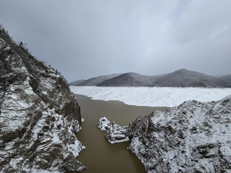 Ninge ca în povești la Barajul Vidraru. Imagini de colecție cu stăvilarul golit de apă, dar acoperit de o ‘pătură’ proaspătă de omăt