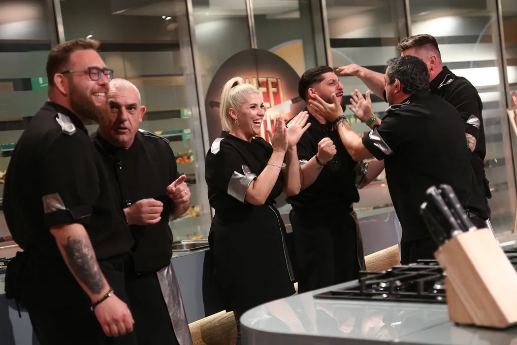 Gheorghe Nicolae se bucură alături de colegii săi de la „Chefi la cuțite”. Foto: Facebook