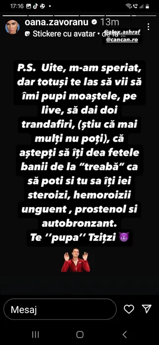 Oana Zăvoranu îl ”pulverizează” pe Alex Bodi cu un mesaj halucinant! ”Mi-a fost teamă că îmi poți fura colanții!”