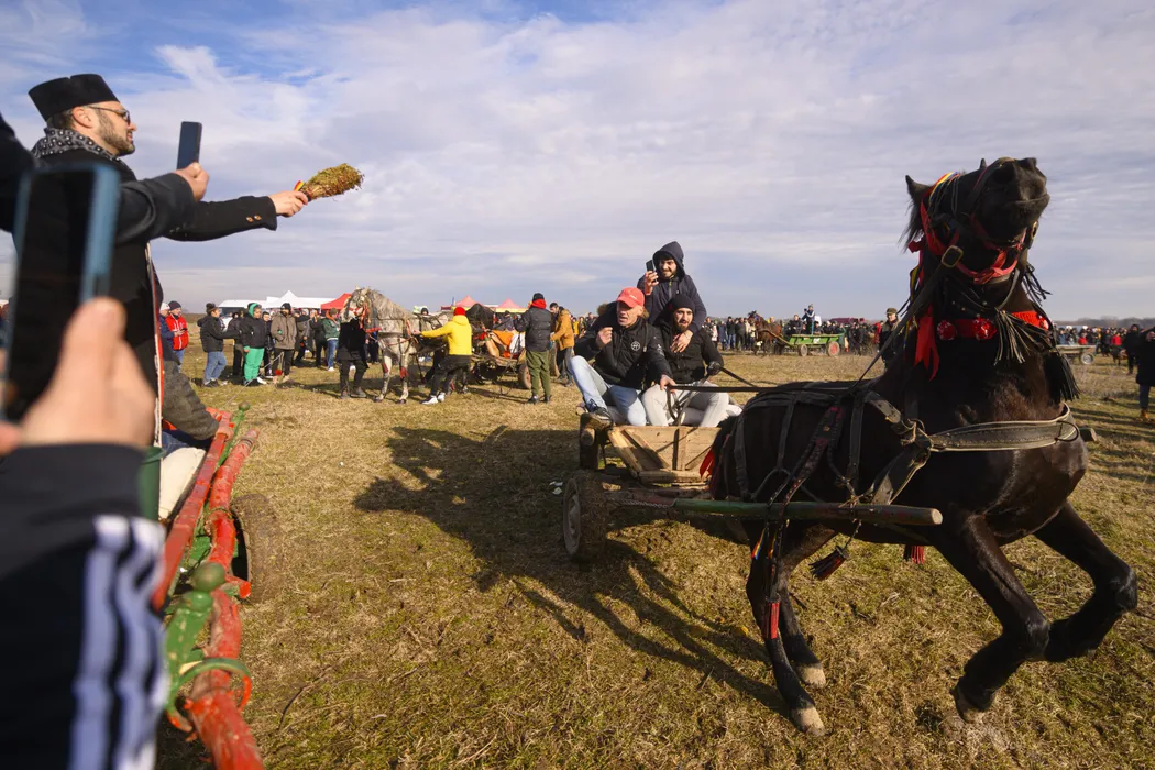 Un preot stropeste cu aghiazma un cal inaintea cursei organizate cu ocazia slujbei de Boboteaza, in Pietrosani, judetul Prahova, luni, 6 ianuarie 2025. In fiecare an, de Boboteaza, satenii din Pietrosani, comuna Puchenii Mari, isi boteaza caii, pentru ca animalele sa fie bune de munca si sanatoase tot anul. Obiceiul consta in botezarea de catre preotul satului Pietrosani a cailor, dupa slujba de Boboteaza. ALEXANDRU DOBRE/ MEDIAFAX FOTO.