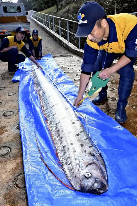 Peștele apocalipsei, de 4,42 metri lungime, găsit într-o plasă fixă în largul orașului Toyooka, fotografiat la Kinosaki Marine World din orașul Toyooka, prefectura Hyogo, pe 24 ianuarie 2019. Foto: Profimedia