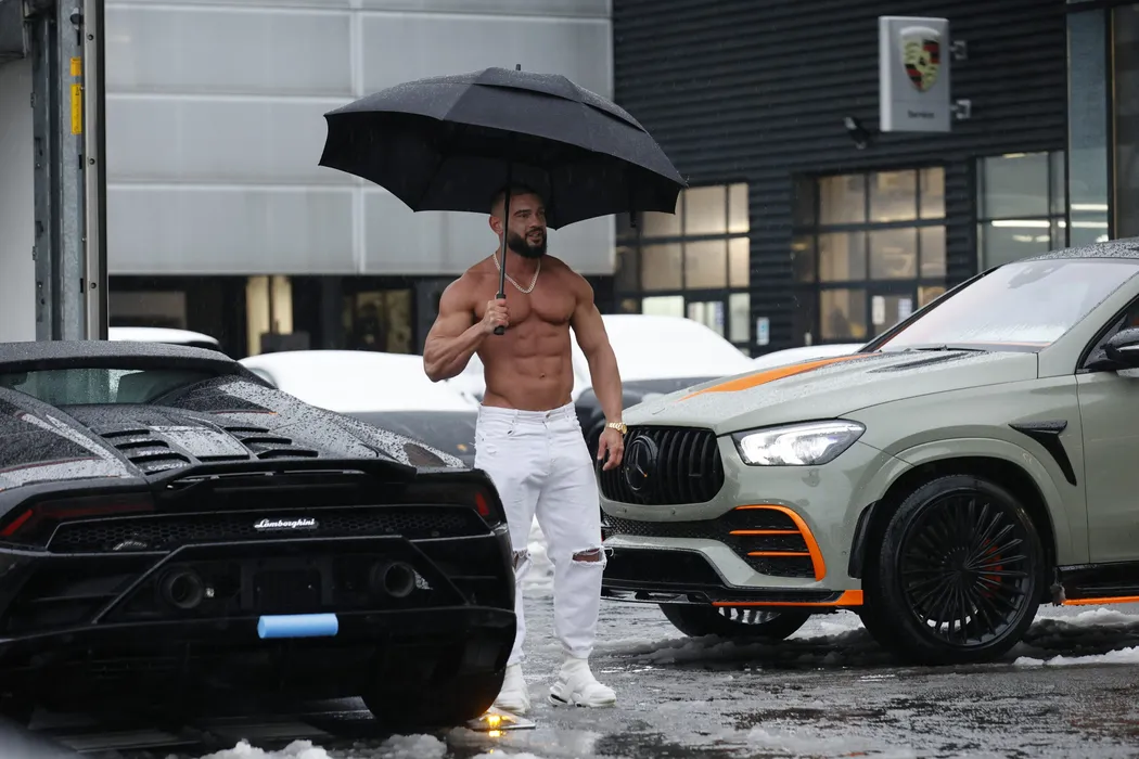 Dorian Popa și-a expus trupul lucrat în fața reprezentanței Lamborghini din București (Foto: CANCAN.RO)