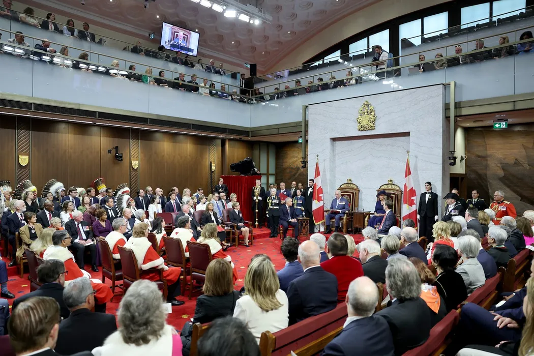 Regele Charles al III-lea și regina Camilla în Camera Senatului pentru deschiderea de stat a Parlamentului în timpul unei vizite oficiale în Canada pe 27 mai 2025 la Ottawa, Ontario. Foto: Profimedia