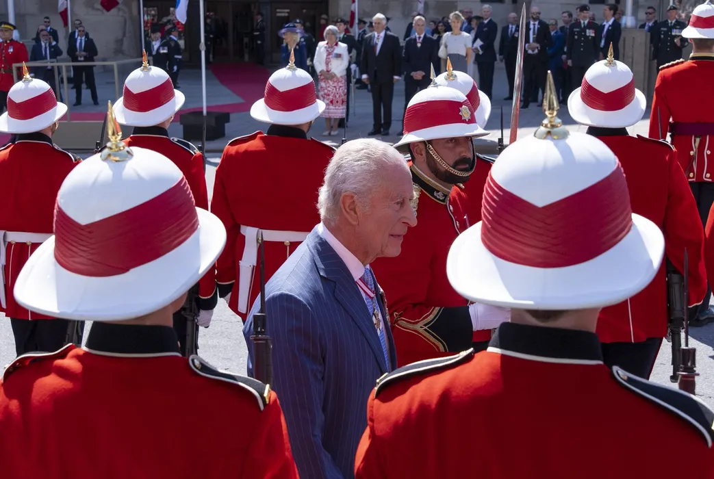 Regele Charles inspectează garda de onoare în fața clădirii Senatului din Ottawa marți, 27 mai 2025. Foto: Profimedia