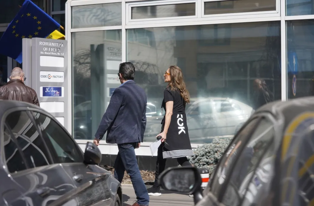Romanița Iovan a ajuns la sediul firmei sale, unde s-a întâlnit cu doi prieteni (Foto: CANCAN.RO)