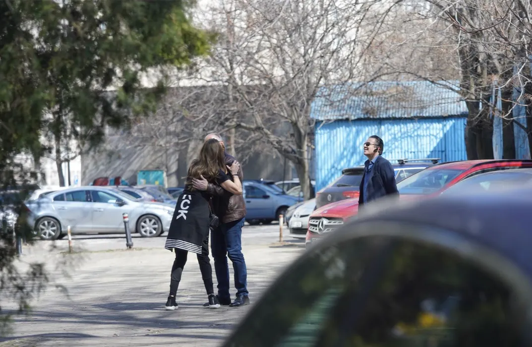 Romanița Iovan a ajuns la sediul firmei sale, unde s-a întâlnit cu doi prieteni (Foto: CANCAN.RO)