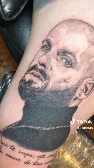 Chipul lui Nosfe tatuat pe corpul lui Lu-K Beats. Sursă: captură Tik Tok