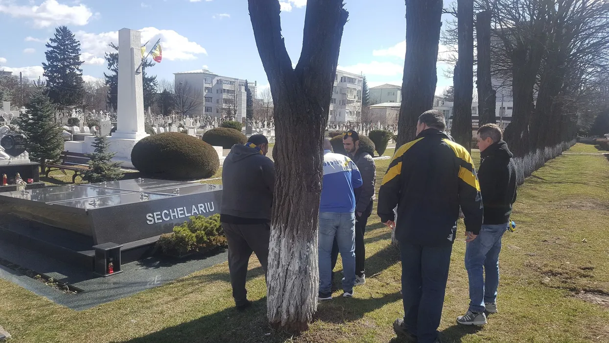 Fanii echipei de fotbal FCM Bacău au aprins fumigene galben-albastre la mormântul lui Sechelariu