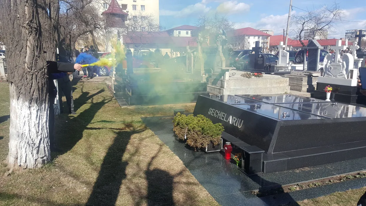 Fanii echipei de fotbal FCM Bacău au aprins fumigene galben-albastre la mormântul lui Sechelariu