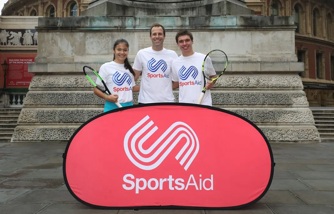 Greg Rusedski (centru) împreună cu sportivii SportsAid Emma Raducanu și Benjamin Heynold la Royal Albert Hall din Londra pentru a lansa parteneriatul caritabil dintre Champions Tennis at the Royal Albert Hall și SportsAid pentru 2017. Foto: Profimedia