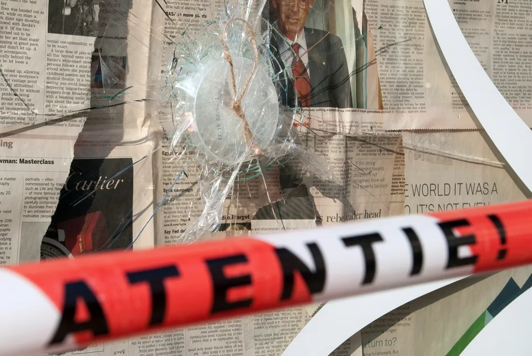 Imagine cu vitrina sparta a coaforului in care doua persoane au fost ucise si sase au fost ranite, in Bucuresti, marti, 6 martie 2012. Agentul de politie Gheorghe Vladan, sofer in cadrul Policlinicii Ministerului Administratiei si Internelor a impuscat opt persoane, doua dintre victime au murit, intr-un coafor din zona complexului Perla din Capitala. ALEXANDRU MIHAESCU / MEDIAFAX FOTO
