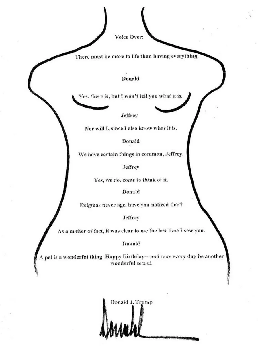 Cu ocazia aniversării vârstei de 50 de ani în 2003, Donald i-a trimis o felicitare personalizată lui Jeffrey sub forma unui contur de trup de femeie, notează The Wall Street Journal.
