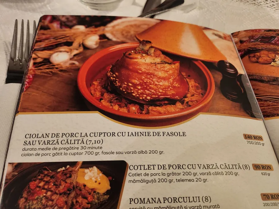 Unul dintre cele mai populare preparate tradiționale din stațiune, ciolanul de porc la cuptor cu iahnie de fasole, costă în 2026 suma de 140 de lei.