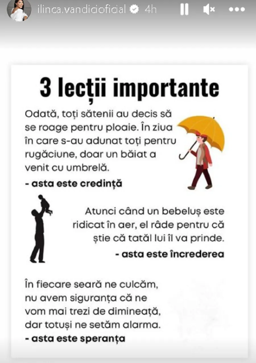În tot acest timp, Ilinca Vandici a lăsat viața să-și urmeze cursul firesc, însă asta nu înseamnă că nu avut timp de răgaz. A reflectat și se pare că a ajuns la anumite concluzii, concluzii ce par să fie catalogate drept lecții importante de viață: ”3 lecții importante: ”Odată, toți sătenii au decis să se roage pentru ploaie. În ziua în care s-au adunat toți pentru rugăciune, doar un băiat a venit cu umbrela” – asta este credința/ ”Atunci când un bebeluș este ridicat în aer, el râde pentru că știe că tatăl lui îl va prinde” – asta este încrederea / ”În fiecare seară ne culcăm, nu avem siguranța că ne vom mai trezi de dimineața, dar totuși ne setăm alarma” – asta este speranța”, este mesajul Ilincăi postat pe Instagram.