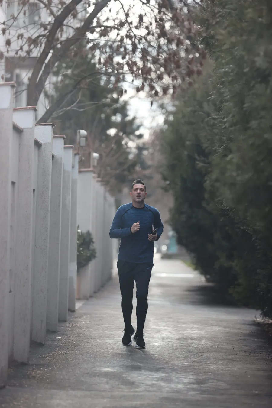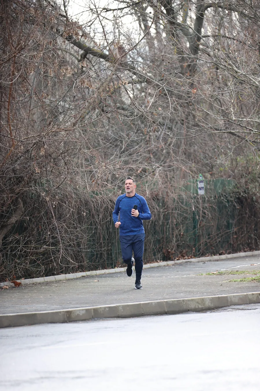Îmbrăcat sport, în pantaloni de trening albaștri Nike, adidași Nike și o bluză tot în aceeași cromatică, fostul antrenor al Craiovei alerga relaxat pe străzile aproape pustii, în ceața groasă care a pus stăpânire pe Nord. Diferența majoră față de trecut? Lipsesc sprinturile agresive spre arbitri și cursele euforice spre propriii jucători după goluri. Acum, singura linie pare să fie cea trasată de aplicația de fitness din telefon.