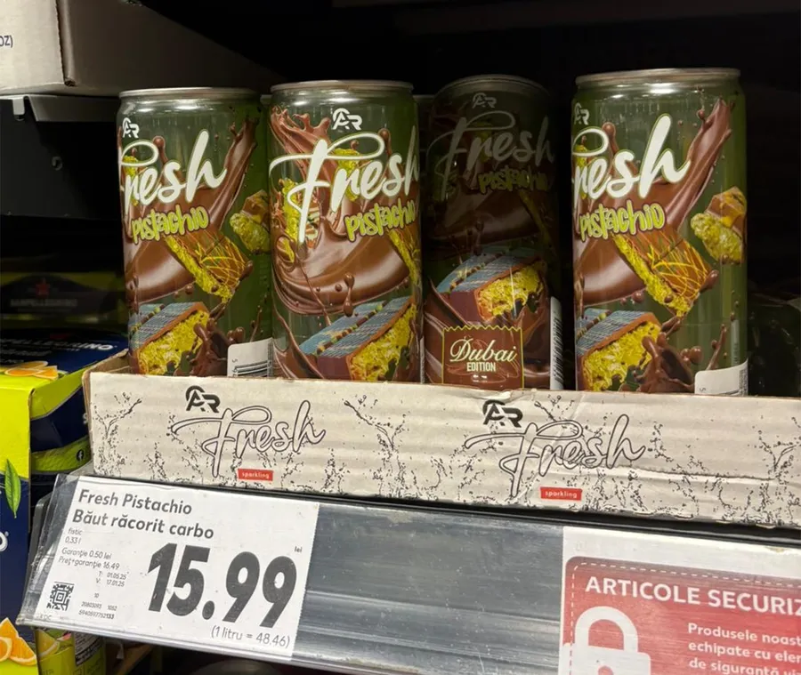 În magazinele Kaufland din București se vinde o băutură răcoritoare carbogazoasă care le-a atras atenția consumatorilor: „Fresh Pistachio băutură răcoritoare carbogazoasă”. Cei ce își doresc să încerce sucul trebuie să plătească 15,99 lei, dar și garanția pe ambalaj de 50 de bani. Promite un gust inedit, cu arome de fistic și ciocolată.