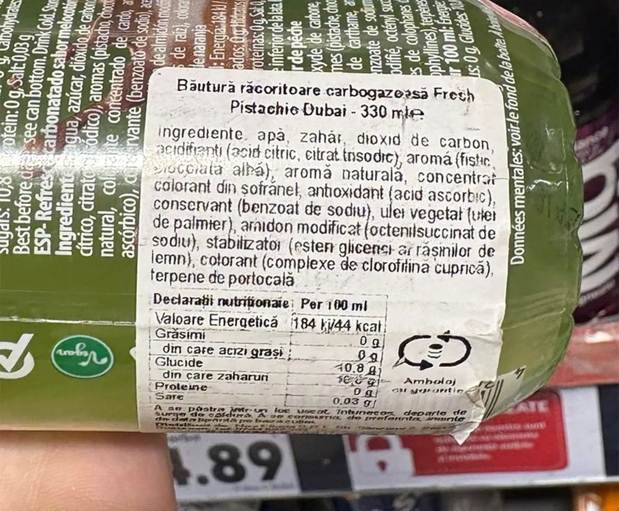 „Ingrediente: apă, zahăr, dioxid de carbon, acidifianți (acid citric, citrat disodic), aromă (fistic, ciocolată albă), aromă naturală, concentrat colorant din șofranel, antioxidant (acid ascorbic), conservant (benzoat de sodiu), ultei vegetal (ulei de palmier), midon modificat (octenilsuccinat de sodiu), stabilizator (esteri glicemici ai rășinilor de lemn), colorant (complexe de clorofilină cuprică), terpene de portocală”, potrivit etichetei.