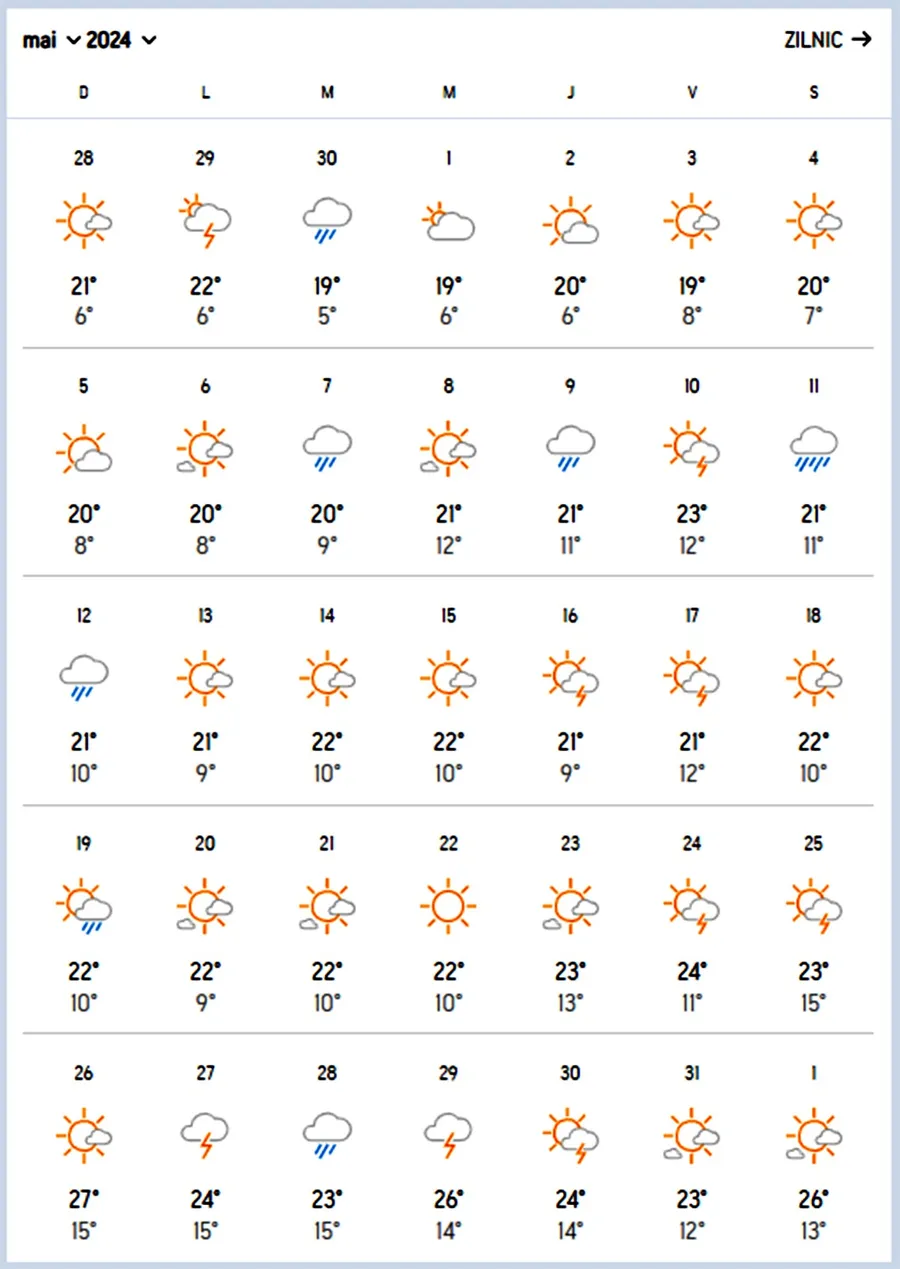 De asemenea, prognoza Accuweather pentru luna mai anunță o vreme însorită, cu precipitații puține. În ceea ce privește valorile termice, maximele vor ajunge până la 26 de grade Celsius, în timp ce minimele nu vor scade sub 6 grade Celsius, asta doar în prima parte a lunii.