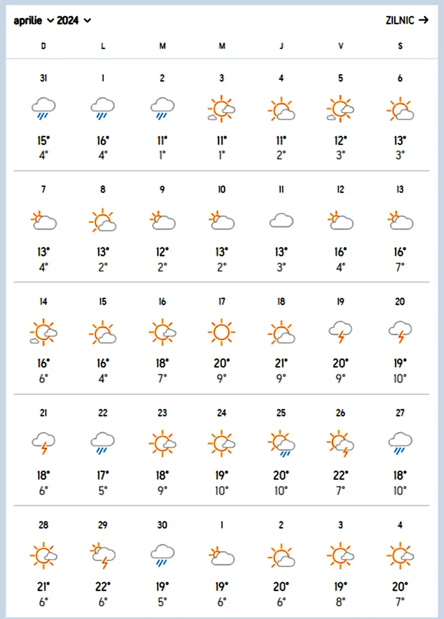 În ceea ce privește luna aprilie, vremea se anunță în principal una călduroasă, cu doar câteva zile ploioase. Precipitațiile își vor face simțită prezența în primele zile ale lunii, dar și spre finalul acesteia. Valorile termice se vor situa între 22 și 1 grad Celsius.