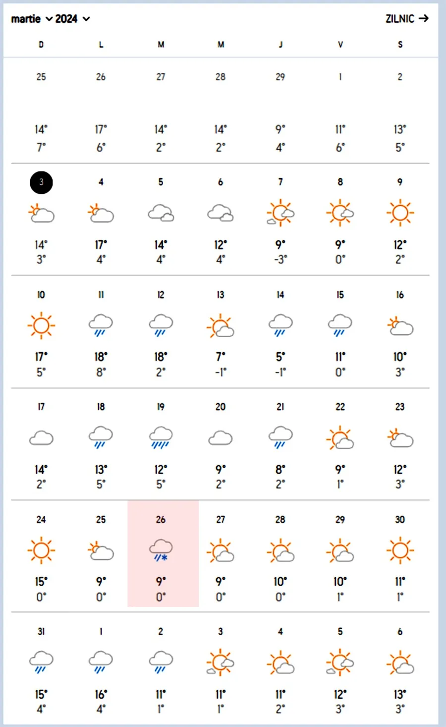 Mai mult, se pare că în luna martie, bucureștenii vor avea parte și de ninsoare. Potrivit prognozei Accuweather, finalul primei luni de primăvară va aduce și zăpadă. Mai exact, în data de 26 martie sunt anunțate ninsori, iar temperaturile se vor situa atunci între 9 și 0 grade Celsius.
