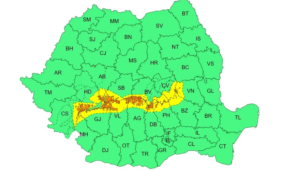 ANM a emis două alerte meteo care rămân în vigoare. Este vorba despre un cod galben de zăpadă viscolită și un cod portocali de viscol puternic. Avertizările sunt valabile în intervalul 25 februarie, ora 20:00 – 26 februarie, ora 08:00.