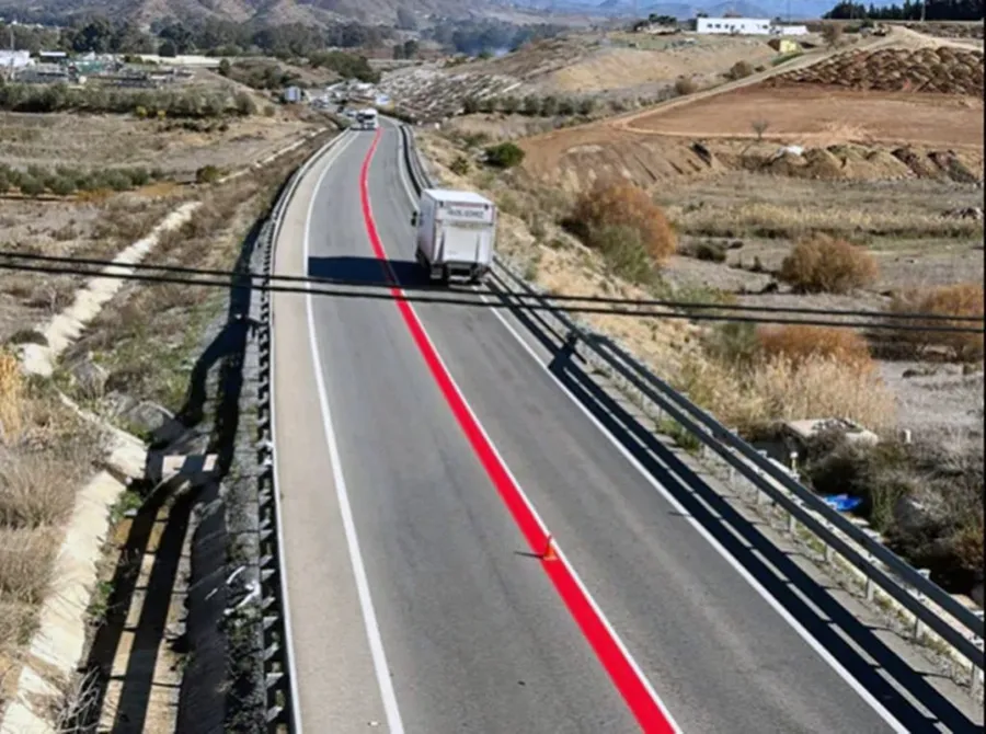 Această măsură a fost implementată recent de Direcția Generală a Traficului (DGT) din Spania, fiind testată pe anumite tronsoane de drum cu un număr mare de accidente. Printre locațiile unde linia roșie continuă este deja vizibilă se numără drumul A-355 din Coín, Málaga, o zonă cunoscută pentru problemele frecvente cauzate de depășiri riscante.