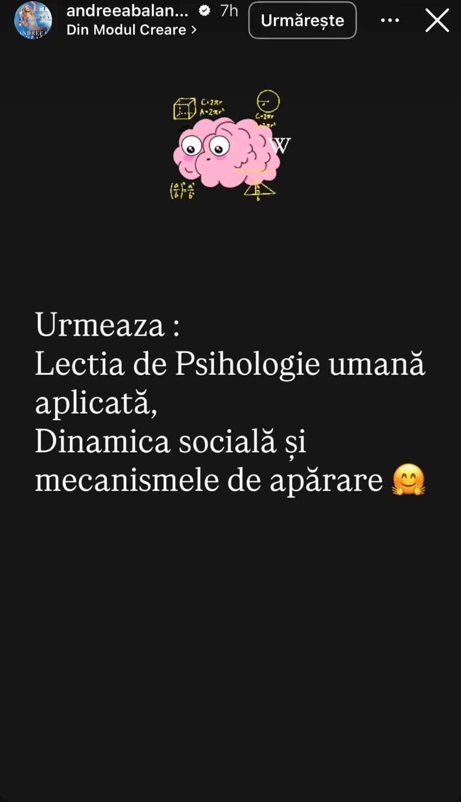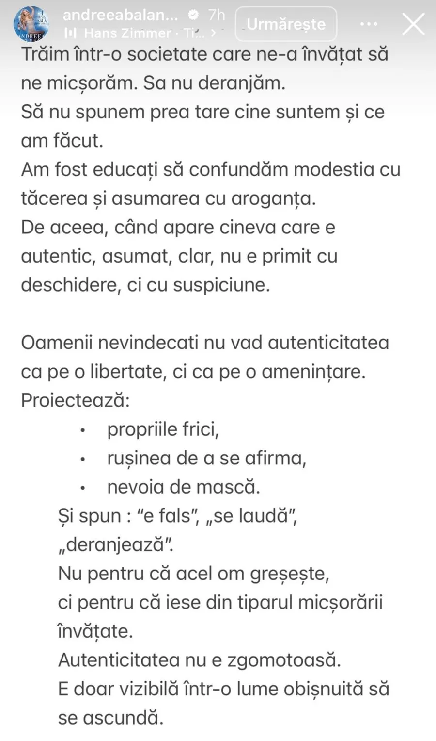 În replică, Andreea Bălan a postat mai multe mesaje filozofice, în care vorbește despre autenticitate, limite și proiecții sociale.