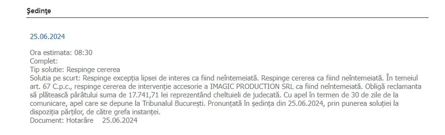 Soluția pe scurt: Respinge excepţia lipsei de interes ca fiind neîntemeiată. Respinge cererea ca fiind neîntemeiată. (…) Obligă reclamanta să plătească pârâtului suma de 17.741,71 lei reprezentând cheltuieli de judecată. Cu apel în termen de 30 de zile de la comunicare, apel care se depune la Tribunalul Bucureşti. Pronunţată în şedinţa din 25.06.2024, prin punerea soluţiei la dispoziţia părţilor, de către grefa instanţei.