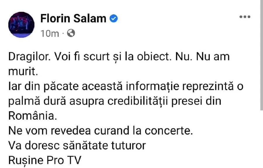 ”Dragilor, voi fi scurt și la obiect. Nu, nu am murit. Iar, din păcate, această informație reprezintă o palmă dură asupra credibilității presei din România. ne vom revedea curând la concerte. Vă doresc sănătate tuturor. Rușine Pro TV”, este mesajul pe care Florin Salam l-a postat pe rețelele de socializare, după ce a fost distribuită informația potrivit căreia acesta ar fi decedat pe patul de spital.